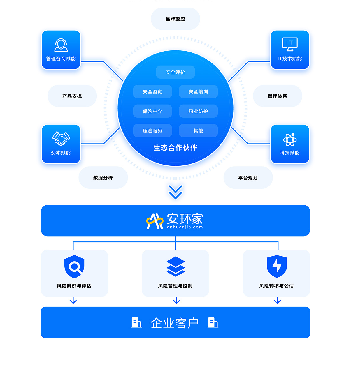 專注安全生產(chǎn)風(fēng)險管理服務(wù)行業(yè)二十載,深諳安全管理服務(wù)行業(yè)供給側(cè)面臨的發(fā)展困局,依托雄厚的資本、強大的科技、領(lǐng)先的技術(shù),向保險經(jīng)紀(jì)公司、保險代理公司、安全評價機構(gòu)、安全咨詢機構(gòu)、安全培訓(xùn)機構(gòu)、職業(yè)健康服務(wù)機構(gòu)等各類生態(tài)合作伙伴輸出“管理咨詢+科技+IT+資本 ”系統(tǒng)性解決方案,全流程、全要素解決生態(tài)合作伙伴的發(fā)展困境,體系化、全面化推進生態(tài)合作伙伴的數(shù)字化轉(zhuǎn)型和產(chǎn)業(yè)化升級,助力生態(tài)合作伙伴實現(xiàn)可持續(xù)發(fā)展。